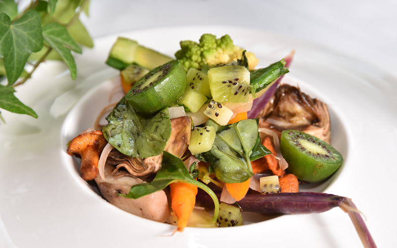 法國菜不是只有田螺、焗鵪鶉有名,還有法國出產的蔬果因夠新鮮而愈來愈受香港人歡迎。早前法國名廚Charles Soussin來港,示範用來自法國的新鮮蔬果,烹煮普羅旺斯式燉菜鍋「雅枝竹時蔬羅勒配奇異果香醋汁」,其中包括有較罕見的雅枝竹。