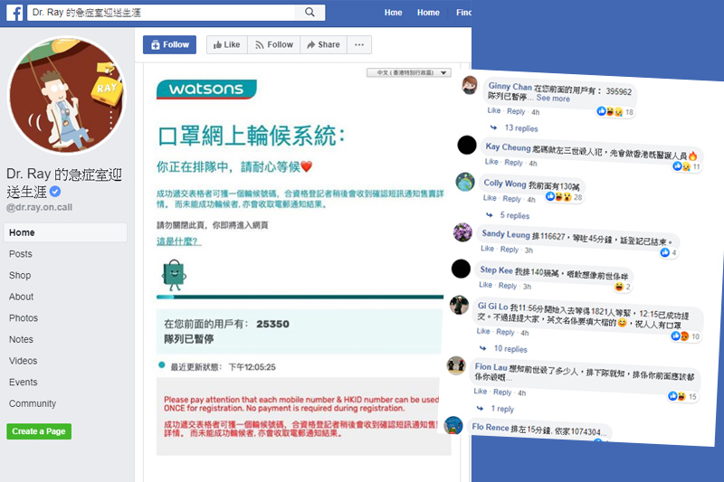 由伊利沙伯醫院急症科專科醫生梁子恆開設的專頁「Dr. Ray 的急症室迎送生涯」今午亦分享輪侯系統「耐心等候」截圖,並表示「11:45開始狂㩒F5」,「個F5掣就嚟爛」,結果「登記到啲資料入去呀,不過未收到Email」。他亦留言指:「點解台灣、新加坡同澳門都有口罩政策;而一個所謂先進嘅香港要淪落到係咁撲口罩。」