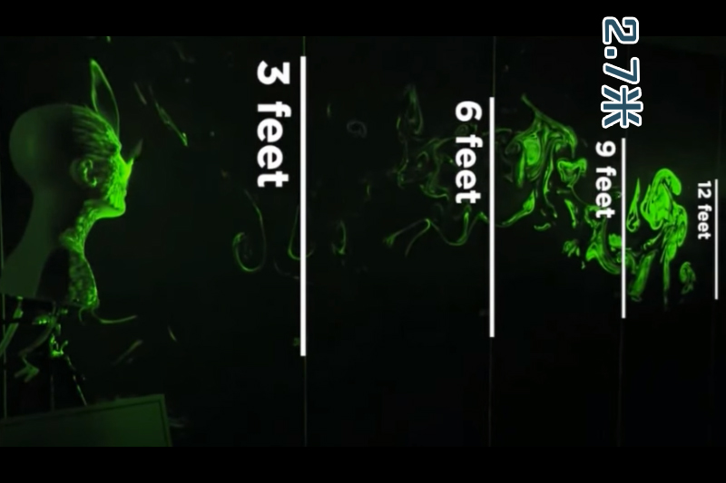 據美國媒體《CNN》報道,美國佛羅里達大西洋大學(Florida Atlantic University)的實驗室內,研究人員製作了一個「假人」,並用氣泵模擬出咳嗽效果,借此測量出在既定時間內,飛沫傳播的距離。研究結果發現,當「假人」沒有配戴口罩而咳嗽的時候,飛沬會四散,只需5秒即可漂至1.8米;在10秒左右可飛達2.7米外;在30至40秒左右,最遠距離可達3.7米。
