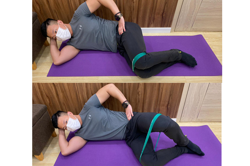 2.把橡筋帶固定在雙膝上方,側臥在地上,膝蓋拍齊,然後慢慢做膝蓋開合動作,重覆10-15次,然後換邊,做2至3組,這動作對改善膝蓋外旋有很大幫助。