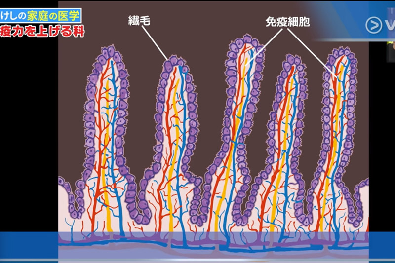 帝京大學醫學部附屬病院上消化道外科教授福島亮治指出:「人體內的免疫細胞有一半以上,都是在腸道裡面。腸臟是一個重要的免疫器官。」除了吸收食物的營養外,小腸亦有另一個重要任務,便是負責免疫的工作。「大家每日會吃不同的食物,而食物中各含有不同的毒素和病菌,而小腸就會起防止病菌進入體內,攻擊人體。小腸內生長了很多絨毛,大約1毫米長和0.1毫米寬,正正在絨毛內有很多免疫細胞,但隨着老化等因素,絨毛或會脫落或變短。」