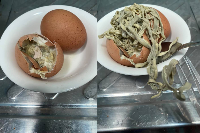 34歲的Rangsiya Sara-uppatham居住在春武里府,近日在蓮花超市購買雞蛋,回後把雞蛋煮熟,怎料到一剝開驚見內裡滿是灰綠色的寛條麵狀不知名物體,隨後在個人社交平台向網友「救助」。這些照片很快就引起泰國網民的注意,紛紛對這奇怪現象充滿疑問,亦有人覺我噁心,還笑言證明「不是假蛋」等。