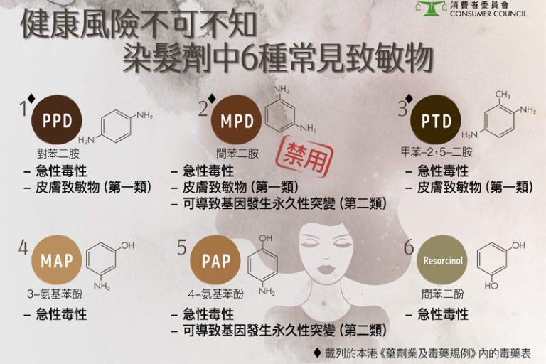 消委會測試市面上26款半永久或永久性染髮劑樣本,聲稱成分「天然」、「草本」、「植物成分」,或「有機」的染髮劑,售價由$18至$450不等,當中包括7款染色護髮素、13款含氧化染料的永久性染髮劑,以及6款草本海娜染髮粉,顏色型號主要以黑色及深啡色為主。結果發現,6 成樣本含致敏物質或重金屬,均為永久性染髮劑及草本海娜染髮粉,存在較大使用風險,提醒市民切勿誤以為產品成分較「天然」,便掉以輕心。