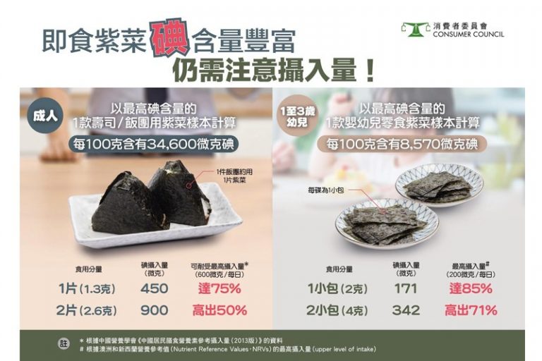食用2份碘含量最高的樣本「寶寶百味Baby Basic」Organic Baby Seaweed(No Added Salt)(共4克,即2包)會攝入342微克碘,已超出中國營養學會、澳洲和新西蘭建議1至10歲小童的碘每日最高攝入量。因此,家長每次應提供適量紫菜予幼兒食用,以免過量攝入碘。