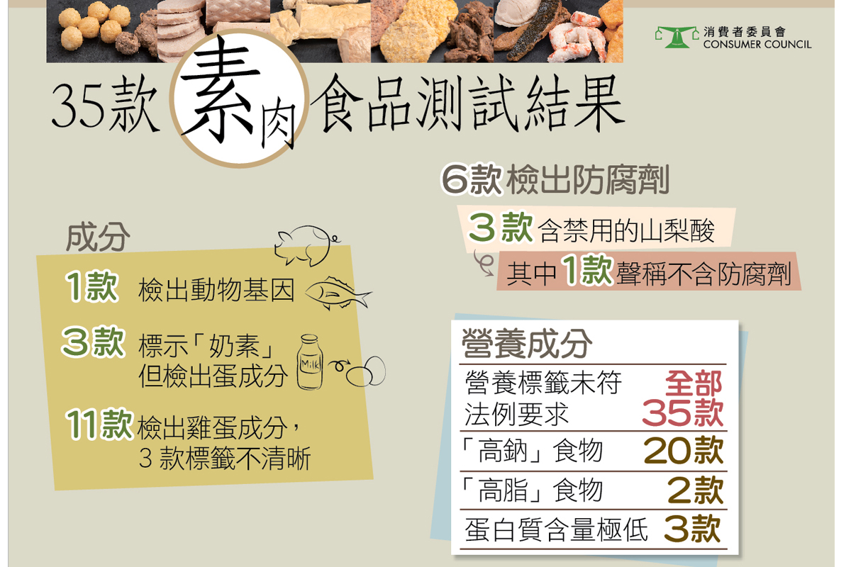 Go Green生活是近年的飲食趨勢,茹素不僅是宗教原因,還是追求飲食清淡、健康人士的生活態度。然而消費者委員會測試市面上 35 款預先包裝素肉,發現種種問題,包括 6 成樣本屬「高鈉」食物,而全部樣本的營養標籤都未完全符合食物安全中心(食安中心)指引要求,最嚴重 1 款的總脂肪含量較標示高逾 8倍;另有1 款樣本檢出豬和魚的基因、3 款標示「奶素」的樣本卻檢出雞蛋成分、6 款檢出含有防腐劑但沒有標示、11款檢出雞蛋成分等等。