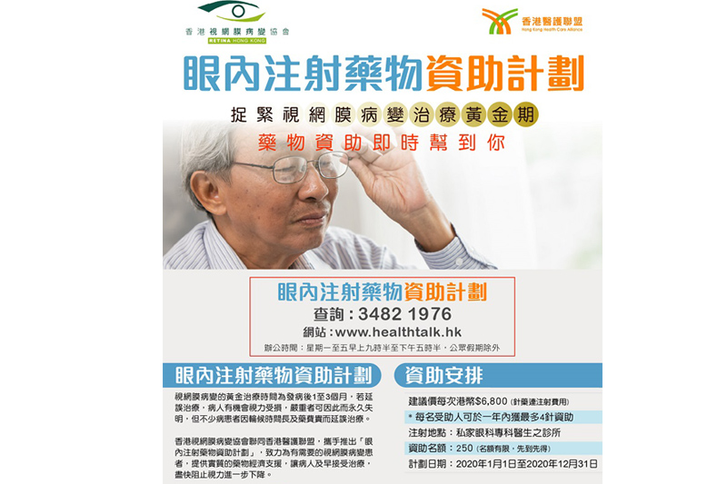 最常見視網膜病變為老年黃斑病變患,多數視網膜病變均可以眼內注射藥物治療,黃金治療時間為發病後1至3個月,若延誤治療,患者有機會視力受損,嚴重者可致永久失明。然而,新型冠狀病毒肆虐香港,醫管局於2月10日宣布調整非緊急和非必要服務,部分專科門診新症病人或須改期覆診和接受治療,當中包括視網膜病變患者。有見及此,香港視網膜病變協會及香港醫護聯盟早前宣布增加「眼內注射藥物資助計劃」名額。