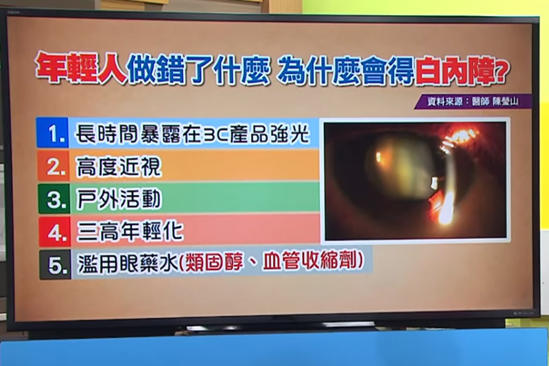 在節目中,中國醫藥大學眼科主任陳瑩山分享過往曾經遇過一個病患,他是住在基隆的15歲男生,本來很喜歡每逢周六、日到海邊去釣魚,過了一段時間後,就發覺很奇怪,「每次老師在上課的時候,有一隻眼睛(看東西)暗暗的,另一隻亮,就造成很大的困擾,後來一檢查發現,其實視力沒有影響,反而是視覺品質受影響,是『年輕型白內障』。」