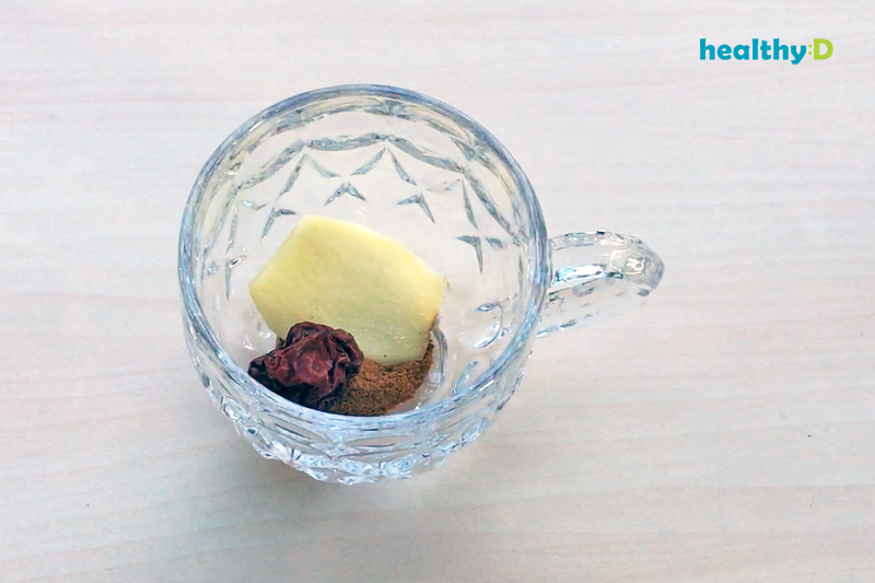 1. 將肉桂、生薑、紅棗、茶包放入杯中,加入熱水,焗10分鐘。