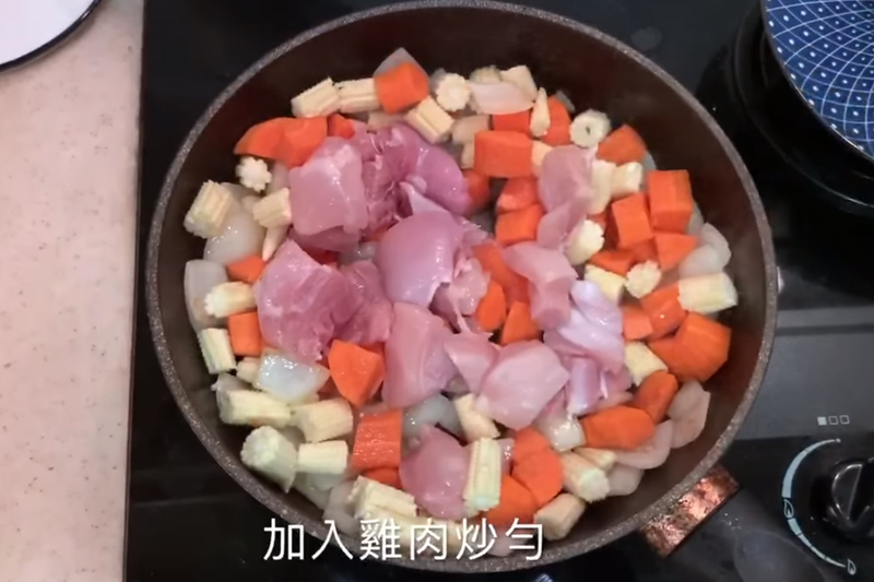 2. 燒熱易潔鑊下油,加入洋蔥炒香,加入紅蘿蔔、粟米筍和雞肉炒勻。