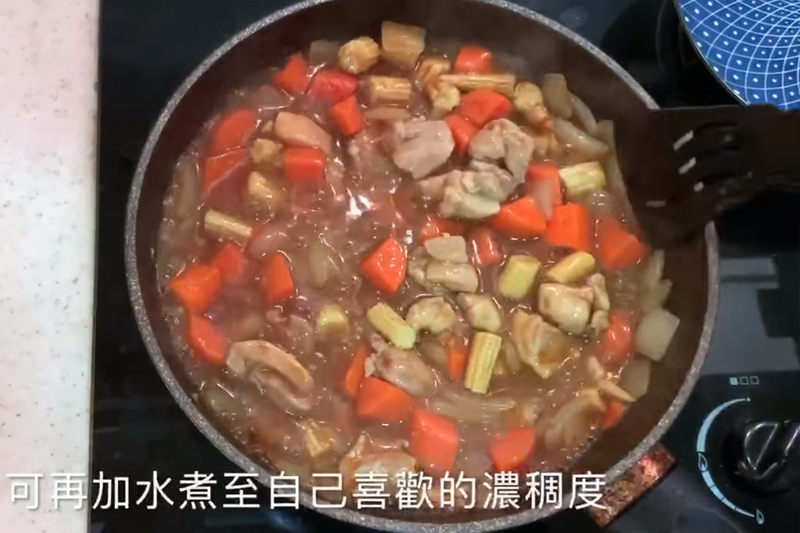 4. 加入咖喱粉再煮2分鐘(可再加水煮至自己喜歡的濃稠度),配上白飯即成。