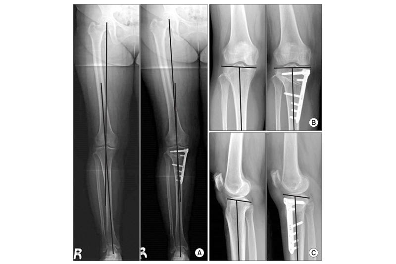 高位脛骨截骨術的原理是,於小腿脛骨上方切開缺口後,將脛骨微曲及固定後,按力學原則將膝關節的受力角度轉向往外側,以減輕內側受力引起的痛楚,保護內側已有損磨的軟骨,當中會植入物料作固定及輔助脛骨復原。由於手術複雜度較低,約歷時1至2小時即可完成。患者於術後4至6星期已可復康,得以減少疼痛及減慢關節磨蝕,手術效果大約維持10年。楊仕俊醫生解釋,由於高位脛骨截骨術只可改變膝關節受力情況,對整體膝結構沒有改變,所以要挑選勞損未算太差的患者。(圖片來自Offical Journal of Korean Knee Society)