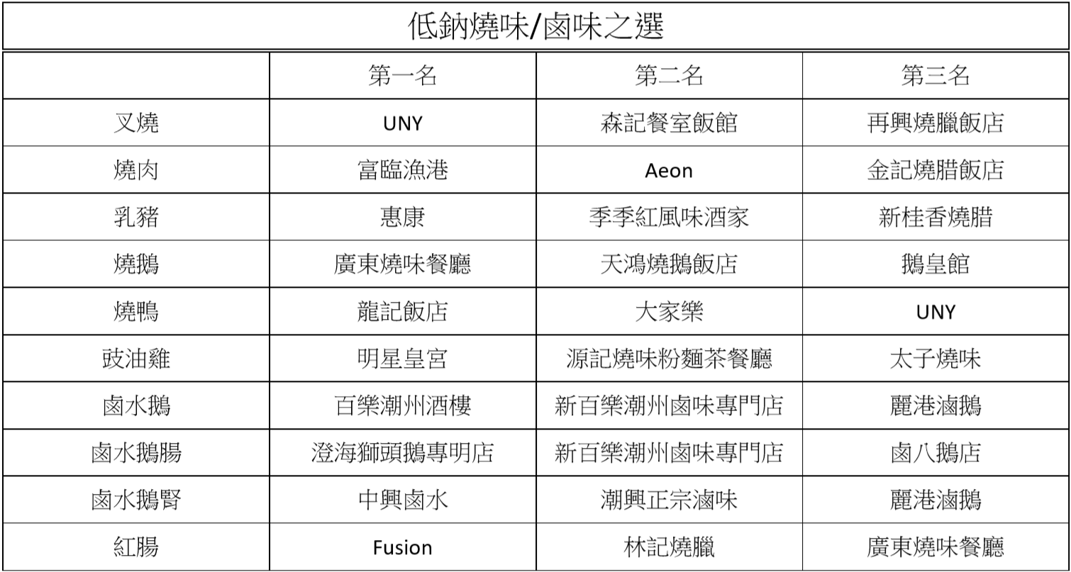 是次測試100款樣本涵蓋10類常見的燒味和鹵味,分別是叉燒、乳豬、燒肉、燒鵝、燒鴨、豉油雞、鹵水鵝、鹵水鵝腸、鹵水鵝腎及紅腸,以及叉燒汁及鹵水汁的鈉含量。