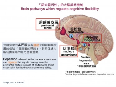 研究發現,這種應變能力腦內一種名叫「多巴胺」的化學物質有關,主要用於腦細胞間傳遞訊息。是次研究發現釋放於伏隔核中的多巴胺,能夠調節來自前額葉皮層的信號,對於促進大腦切換策略的能力至關重要。