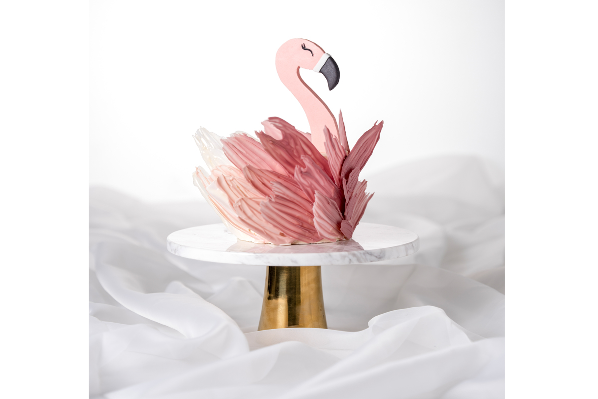 相信沒有人能抵擋粉紅色的魅力,以朱古力製成的火烈鳥蛋糕造型華麗之餘,更讓人為之驚艷。鳥身的羽毛為人手上色,質感十足。白巧克力糖霜不含糖分,令進吃的罪惡感大大減低。