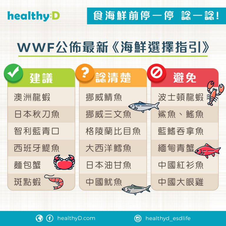 新修訂的《海鮮選擇指引》加入26種海鮮,合共有72種海鮮,其中29種「紅色」避免食用;18種「黃色」想清楚才食用;25種則為「綠色」建議食用。