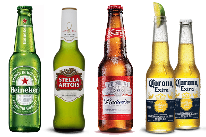 【啤酒致癌】其他於是次檢測中驗出含有草甘膦的啤酒,包括有Budweiser百威(27.0ppb)、Corona Extra(25.1ppb)、Heineken喜力(20.9ppb)、Guinness Draught健力士(20.3ppb)、Stella Artois(18.7ppb)。(圖片來源:Budweiser官網、drizly.com(Heineken)、www.lk.co.nz(Corona Extra、Stella Artois))