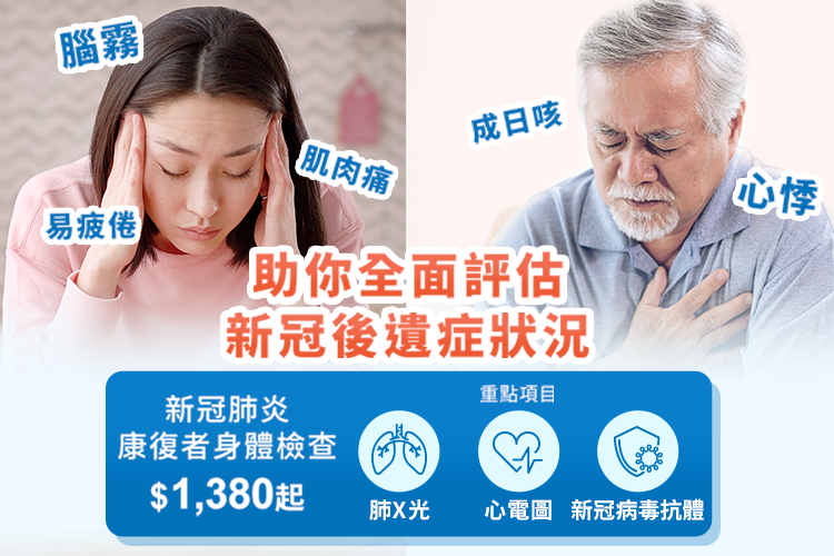 即使已從新冠肺炎康復,亦不能掉以輕心,因為現在有所謂「長新冠」的新冠肺炎後遺症。「長新冠」一般是指康復者有腦霧、心悸、脫髮和腸道失衡等後遺症。要知道自己的康復後的健康狀況,最好做個針對性的身體檢查,透過肺部X光、心電圖等項目驗清身體機能!