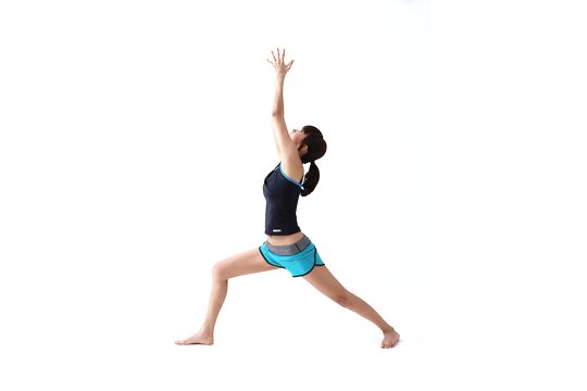 將右腳踏前,雙手置中間位置,右膝蓋彎曲,左腿向後伸直。立直上半身, 將雙手合十向上伸延。