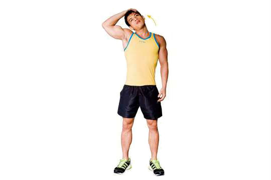 將右手舉起放至左耳際,並將頸部向右輕壓,停頓15秒後,換另一邊進行。