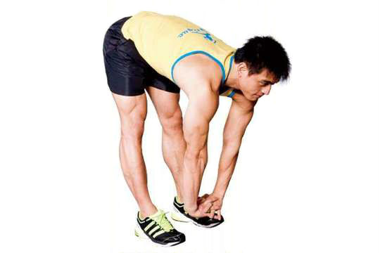 驅幹挺直,雙手交叉向下伸展至觸碰地面,停留30秒。