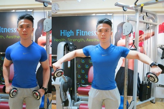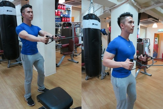 Step 2:呼氣同時張開雙臂,保持肘部的角度,直至手臂與肩膊打橫成水平線,維持約1秒,然後吸氣並慢慢地收回雙臂回到開始時位置。