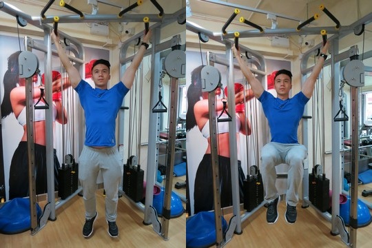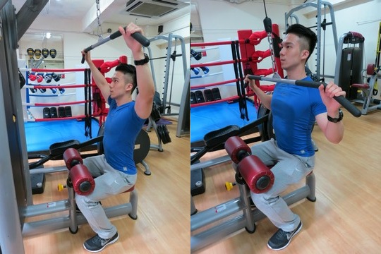 Step 2:手保持微曲,呼氣同時將拉桿向下拉至頸前位置,留意身體不要向前或向後傾,維持約1秒,然後吸氣,慢慢放回原來位置。