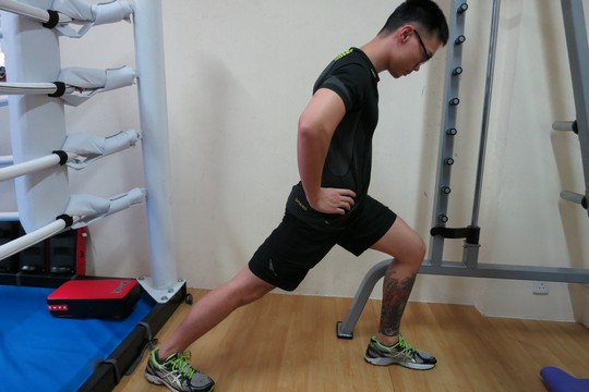 步驟:弓步姿勢,挺胸收腹,後腳跟不離地,身體緩慢地往前傾向下至感覺大腿前側及小腿後側緊繃,維持15至30秒,換邊重覆。