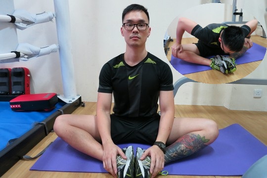 步驟:坐姿,雙腿彎曲,腳底併合,身體慢慢往前傾至感覺大腿內側緊繃,維持15至30秒。