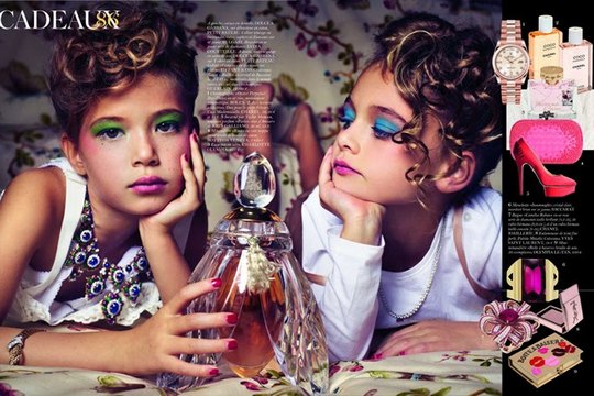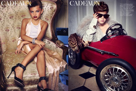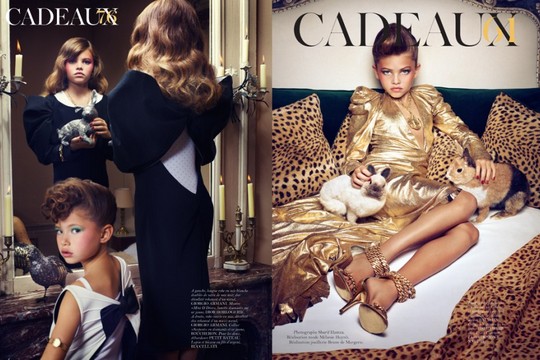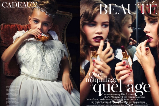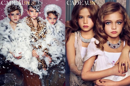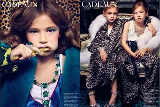 法國版Vogue期刊登了一輯名為《Cadeaux》的系列照片,相片中的女主角是數位年幼的模特兒穿上華麗而成熟的服裝、塗上濃妝豔抹,在鏡頭前擺出的性感姿勢,表現如專業模特兒毫無分別。此事惹起了公眾的關注,不同階層人士對兒童的成熟打扮意見南轅北轍。小孩應該追求天真可愛,還是跟貼大人的潮流呢?