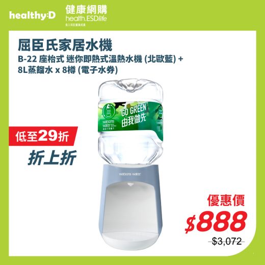 - 屈臣氏家居水機 B-22座枱式 迷你即熱式温熱水機(北歐藍)+8L蒸餾水x8樽(電子水券)