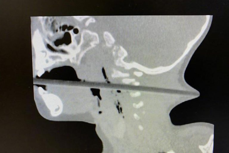 家人其後將林林送往南京市兒童醫院求診,該院神經外科主治醫師邱德智立即為林林安排做檢查。結果發現,長20多厘米的筷子從患者的「口腔進入,經過咽部後壁,通過頸椎2、3 間隙,一直向後到達後頸,幾乎戳穿了皮膚,從後頸可以清晰地看見筷頭。」