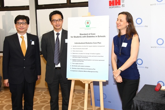 世界糖尿病聯盟(International Diabetes Federation)自2007年起將每年11月14日定為世界糖尿病日,旨在喚醒全球超過10億人關注糖尿病的嚴重性,鼓勵各界採取實際行動,聯手對抗病症。早前香港兒童糖尿協會主席何苗春暉女士(上圖右)、合和實業有限公司企業事務董事及公司秘書羅左華先生(上圖中)和兒科專科醫生余則文醫生(上圖左),便一起為「護理標準」(Standard of Care)揭幕,希望確保每所學校均為糖尿病兒童制訂一份「個人化的糖尿病護理計劃」。