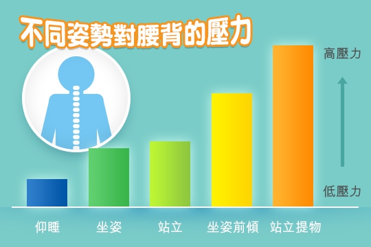 躺著時因脊骨不是直立,減少了椎間盤受地心吸力的壓力,所以腰背受壓較坐著低,而坐著亦稍微為站著時低。