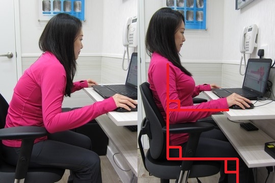 坐着工作時,應以90度角坐直,背脊應挨著椅背使背部有足夠的承托,雙腳可放在地上或腳踏上,使臀和膝蓋成90度;手肘放在座椅的扶手上,令手臂伸直時能剛好碰到滑鼠和鍵盤,並注意頭部不要向前傾(如上右圖)。