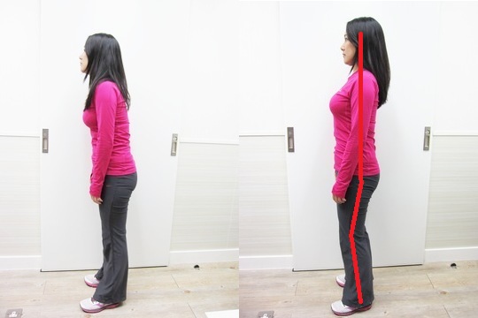 3.膊頭打開、微微收下巴,耳洞與膊頭、盤骨中間、膝蓋和腳跟的位置成一直線(如上右圖);
