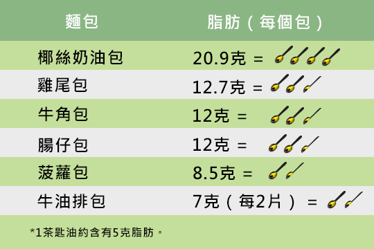 根據食安中心指引,每100克食物如含有超過20克脂肪,就屬於高脂食品。市面上的牛角包、雞尾包和椰絲奶油包都可能在高脂之列!