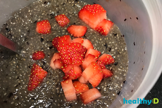 3. 將士多啤梨切粒,與藍莓汁放入已浸泡的奇亞籽內拌勻。4. 將奇阿籽、水果、脆片,分別放入玻璃瓶內,即成。