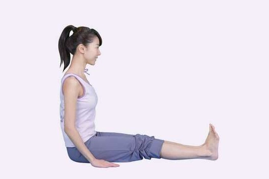 坐在墊子上,雙手自然放於身體兩側,雙腳往前伸直,腳尖朝向上。