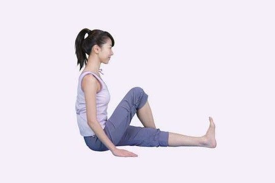 上半身挺直,將左手肘抱著右腳膝蓋,左手放於大腿外側,右手放於身體右後側,並將右腳大腿拉近身體。