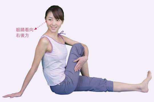 先吸一口氣,再慢慢呼氣,並將身體往右扭轉,眼睛望向右後方,維持動作大約15至30秒。