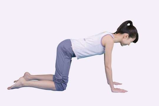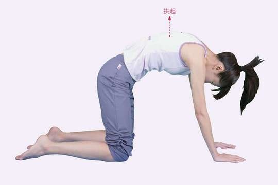 呼氣,腹部往內縮,背部拱起,下巴往內縮,眼睛看著腹部,維持動作大約15至30秒。