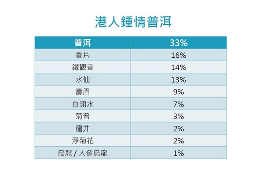 飲茶當然不能缺少「茶」!茶葉方面,普洱成為港人最愛,得到逾3成受訪者支持,遠超過第二位的香片;而鐵觀音及水仙則排列第三及第四位。