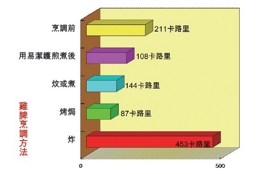 曾有研究測試雞髀烹調前後的熱量,烹調前100克雞髀肉有211卡路里,煎煮後有144卡路里;炆煮後降至108卡路里;烤焗的方法最好,焗後只剩87卡路里;若油炸,熱量會增至453卡路里。故此烹調食物應多採用蒸、煮、焯、焗、烤和炆的煮食方式,減少油炸;又或選用易潔鑊以少油煎香菜餚,減低食物在烹調過程中吸入的油量。
