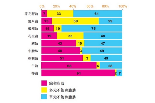 脂肪可分為飽和脂肪和不飽和脂肪。飽和脂肪溶點較高,所以在室溫成固體狀。不飽和脂肪溶點較低,故此在室溫成液體狀。飽和脂肪主要源自動物油脂,如肥膏、皮層、牛油、忌廉、芝士及蛋黃。植物方面,磚裝植物牛油、椰油,以及棕櫚油製造的食物,如即食麵和某些餅乾,亦含大量飽和脂肪。