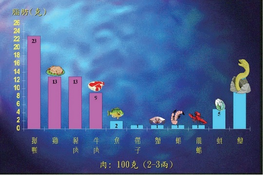肉類以鵝、鴨的脂肪含量最高,連皮計每100克有脂肪23克;其次是雞和瘦肉,平均有脂肪9至13克,魚和海產脂肪含量較低,主要是不飽和脂肪。