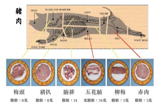 100克五花腩含脂肪34克;腩排有24克;梅頭和豬扒各有8克;柳梅最瘦,只有3克。