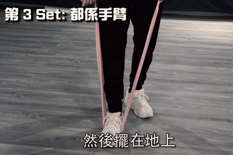 動作:兩手拿着運動型燈帶,人站直並挺胸,之後會向下拉。兩邊也要平衡。每set做12下,Anson Lo建議可做4 set。