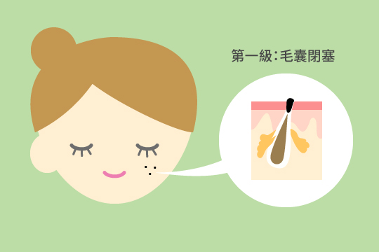 第一級:毛囊閉塞,出現黑頭、白頭。