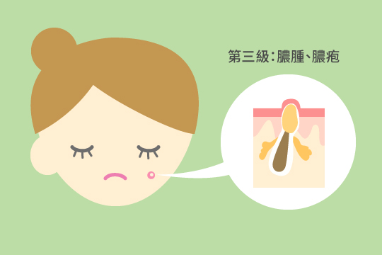 第三級:暗瘡含膿,形成膿疱。