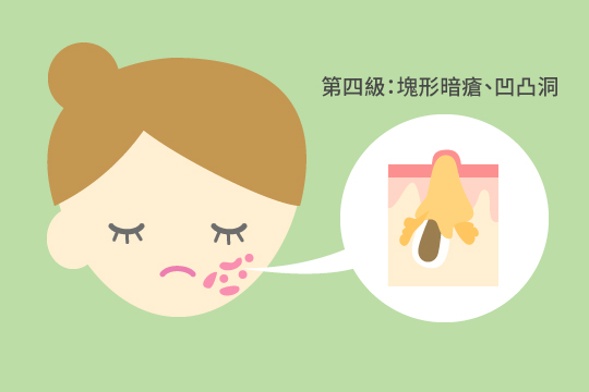 第四級:暗瘡含膿情況嚴重,數顆暗瘡相連,擠出會流膿和滲血,甚至已形成疤痕、凹凸洞、塊形暗瘡(火山口)。